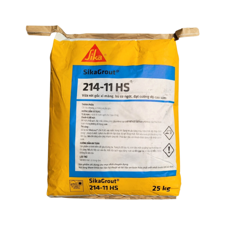 SikaGrout 214-11 HS có thành phần cốt liệu trộn sẵn để trộn với nước tạo hỗn hợp vữa rót có độ chảy cao, đồng nhất, tự san bằng, nhanh đạt cường độ cho phép chịu tải sớm. Vữa không co ngót được sản xuất để chống lại hiện tượng co ngót của bê tông và vữa, hấp thụ, giảm thiểu sự ảnh hưởng của rung động đến nền móng kết cấu.